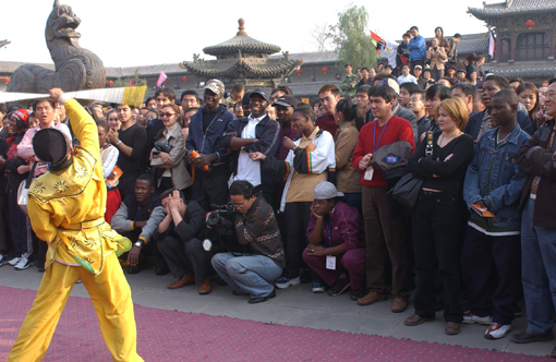 10月18日下午,各國藝術家在山西晉中榆次老城與當地群眾聯歡。